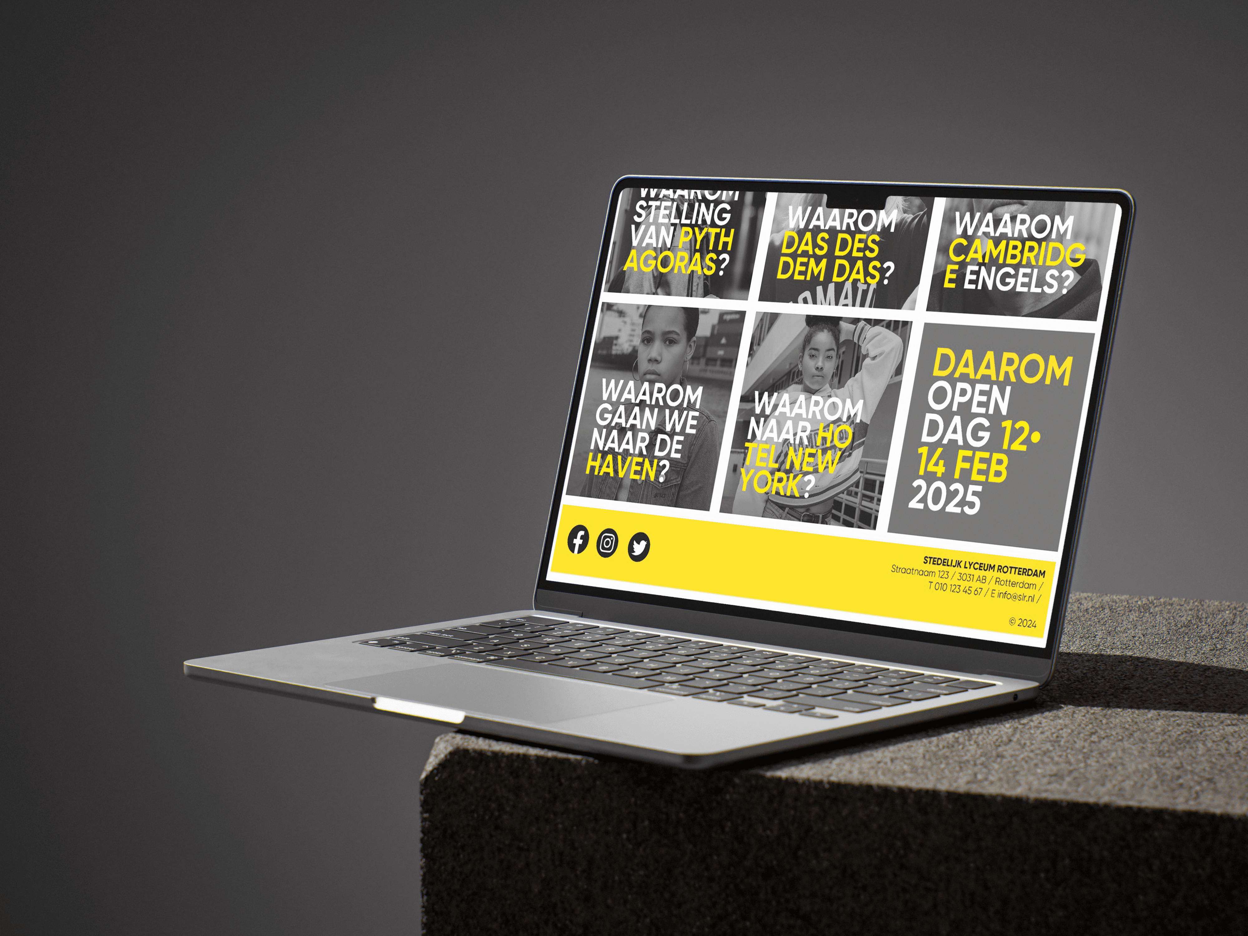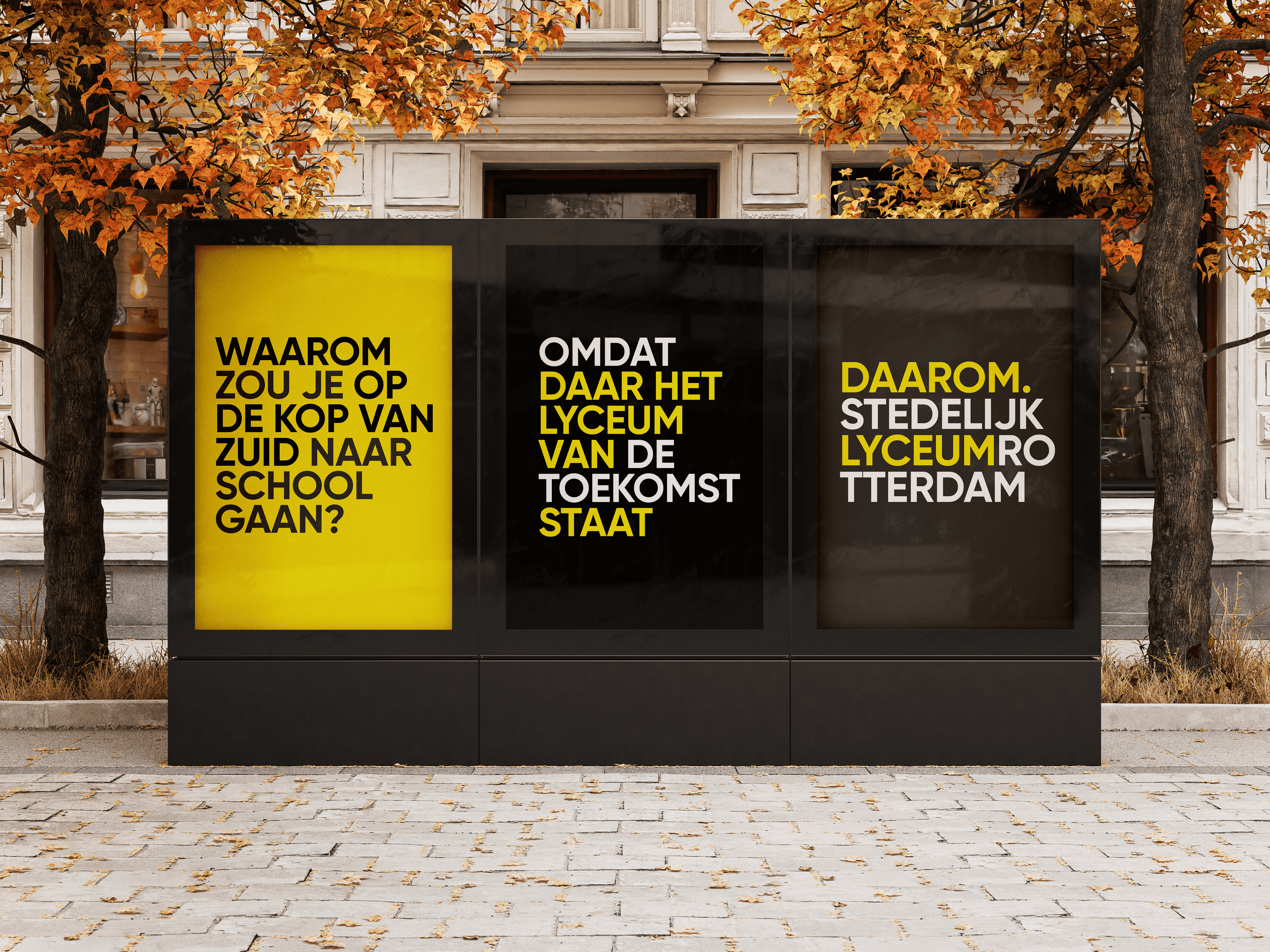 Het nieuwe Stedelijk Lyceum Rotterdam gelooft dat leren pas echt gaat leven als je weet waarom je iets leert. Als je voelt wat het je oplevert. Als je begrijpt waar het je kan brengen. Daarom. Stedelijk Lyceum Rotterdam. Wij hielpen de school zich te positioneren in het stevige concurrentieveld in Rotterdam. Met 'de stad als klaslokaal' biedt de nieuwste middelbare school van Rotterdam haar leerlingen straks het meest relevante onderwijs van de stad.